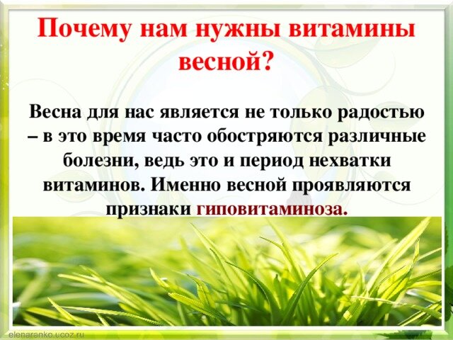Запастись витаминами впрок нереально – приходится постоянно «заправлять» ими организм, особенно весной. Для чего это нужно? Чтобы улучшить общее физическое состояние, предотвратить утомляемость, стрессы и депрессии, укрепить иммунитет, поддержать красоту кожи, волос и ногтей. Давайте разбираться, какие витамины нужны весной и откуда их брать. Каждой группе населения требуется свой рацион: Легче всего взять витамины из продуктов. Но даже если потреблять их килограммами, суточную норму полезных элементов получить невозможно. Поэтому стоит обратить внимание на качественные витаминно-минеральные комплексы, хотя от необходимости правильного питания они не освобождают. Итак, перечислим «витаминизированные» продукты: Самый важный витамин из перечисленных выделить нельзя, поэтому ваше питание должно быть продуманным и сбалансированным. Диетологи рекомендуют взрослым людям ежедневно потреблять 150-200 г нежирного мяса, 500 г свежих овощей и фруктов, 300 г молочных продуктов. Готовьте салаты из