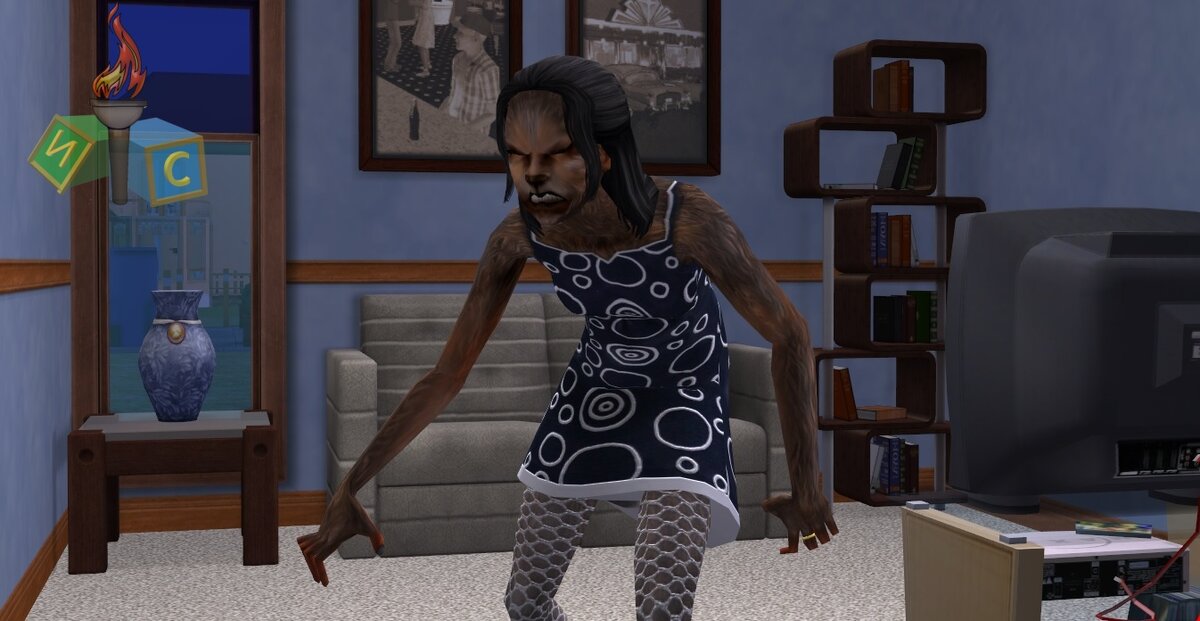 В игре The sims 2 достаточно много разнообразных существ, и сегодня мы рассмотрим еще трех необычных представителей симо-мира. 1. Оборотни, или Вервольфы. Болезнь Ликантропия появляется с дополнением «Питомцы». Заболеть ею не так просто – нашего персонажа должен укусить волк – вожак стаи. В игре он выглядит как большая собака со святящимися глазами. С ним необходимо обзавестись близкими отношениями, чтобы он укусил сима, для этого может понадобиться не одна ночь! Чтобы повысить вероятность посещения вожаком вашего участка, нужно, чтобы все вокруг заросло сорняками и мусором. Также волк чаще приходит к дому, где есть маленькие дети или животные. После 8 вечера ваш персонаж превращается в злого Вервольфа: его тело покрывается шерстью, мы не можем изменить его внешность, ходит на полусогнутых, чувство голода резко падает, а вот энергия – наоборот, просто переполняет сима. Характер оборотня более агрессивный, зато с животными общий язык найти намного проще – дрессировка питомцев проходи