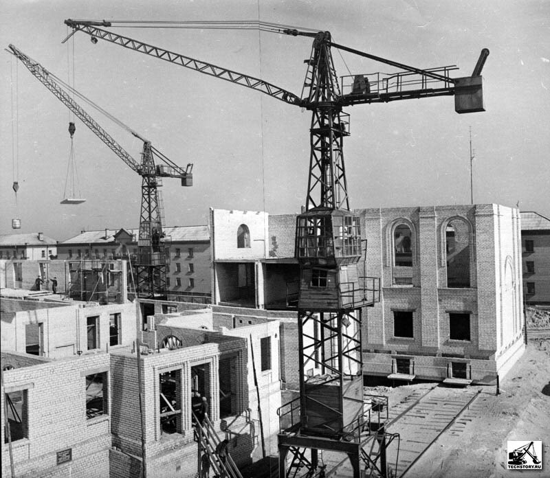Нет фото – опять к концу стрелы за недлинный трос прицепляют грузовик или трактор. Он оттягивает стрелу на 10-15°, чтобы начать её подъём стреловой лебёдкой. Эта проблема была потом решена простейшими упорами-оттяжками, столь характерными для серии КБ.