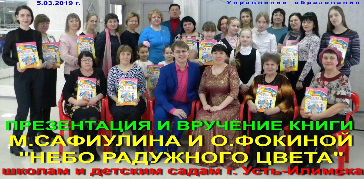 5 марта в Управлении образования состоялось торжественное вручение книги Максима Сафиулина и Ольги Фокиной "Небо радужного цвета" ВСЕМ ШКОЛАМ И ДЕТСКИМ САДАМ Г. УСТЬ-ИЛИМСКА. Это яркая, красочная, познавательная книга для детей дошкольного, младшего и среднего школьного возраста, учителей, воспитателей, библиотекарей. Мелованная бумага, прошитый блок, твердый переплет, 128 страниц только добрых стихотворений и добрых иллюстраций (один из лучших современных художников)! Подробнее о книге внутри ссылки: https://www.youtube.com/watch?v=JweHGhlofWI Приглашали представителей всех школ и детских садов. Пришли и ПОЛУЧИЛИ СВОИ ЭКЗЕМПЛЯРЫ с дарственной надписью и автографами от авторов книги следующие организации: - МАОУ «Экспериментальный лицей «Научно-образовательный комплекс»; - МАОУ «СОШ № 5»; - МБОУ «СОШ № 8 имени Бусыгина М.И.»; - МАОУ «СОШ № 14»; - МБОУ «СОШ №17»; - МБДОУ №12 «Брусничка»; - МБДОУ д/с № 15 «Ручеёк»; - МБДОУ д/с № 17 «Сказка»; - МБДОУ д/с № 24 «Красная шапочка»; - МБДОУ д/с № 25 «Зайчик» (отдельная благодарность сотрудникам за подготовку воспитанников, которые читали стихотворения Максима Сафиулина на этом мероприятии - неожиданный и приятный сюрприз); - МБДОУ д/с № 32 «Айболит»; - МБДОУ д/с № 34 «Рябинка»; - МБДОУ д/с № 35 «Соболек»; - МБДОУ д/с № 38 «Лесовичок»; - МОУ «Железнодорожная СОШ № 1»; - МОУ «Железнодорожная СОШ № 2»; - МОУ «Эдучанская СОШ»+ДОУ; - МДОУ "Малыш" (р.п. Железнодорожный). ВО ВСЕХ ЭТИХ ОРГАНИЗАЦИЯХ ТЕПЕРЬ ЕСТЬ КНИГА МАКСИМА САФИУЛИНА И ОЛЬГИ ФОКИНОЙ "НЕБО РАДУЖНОГО ЦВЕТА". Приглашайте нас в свои учреждения с творческими встречами (у нас есть стихотворения и песни для абсолютно разного возраста). Надеемся на дружбу и сотрудничество. ЕСЛИ ОСТАЛЬНЫМ ОРГАНИЗАЦИЯМ НУЖЕН ЭКЗЕМПЛЯР КНИГИ "НЕБО РАДУЖНОГО ЦВЕТА" С ДАРСТВЕННОЙ НАДПИСЬЮ ОТ АВТОРОВ, то приглашайте в свои организации с творческими встречами: городская гимназия №1, школы №№ 1, 2, 7, 9, 11, 12, 13, 15, детские сады №№ 1, 5, 7, 8, 9, 14, 18, 22, 29, 30, 31, 37, 40, ЦДТ и организации района: Бадарминская, Ершовская, Невонская, Подъеланская, Седановская, Тубинская школы, РЦДОД, садики "Березка", "Чебурашка" (Железнодорожный), "Журавушка" (Невон), "Брусничка" (Тубинский), "Ёлочка" (Седаново).