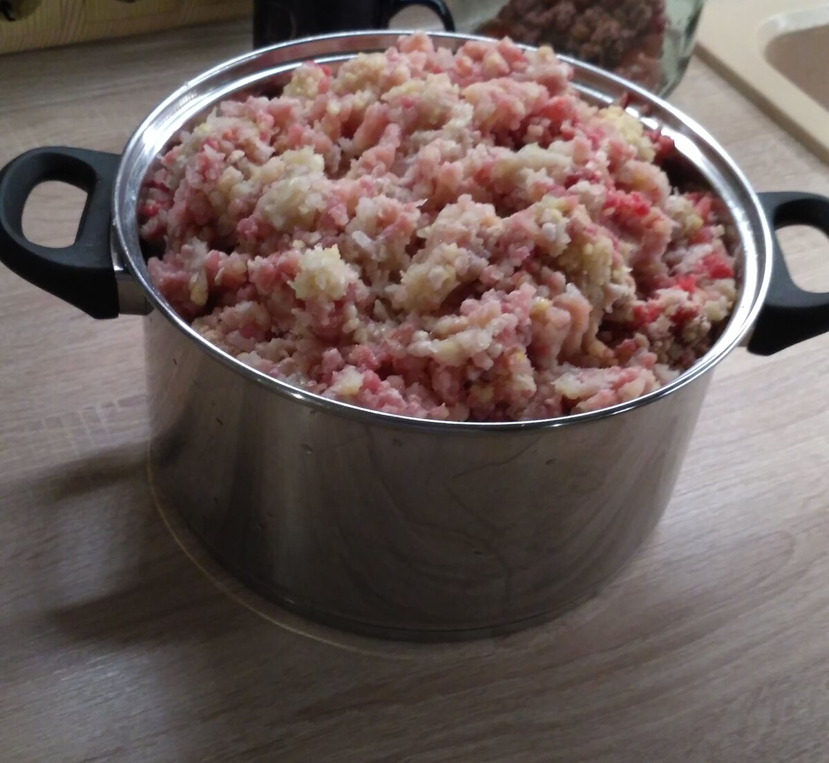 И так фарш. Начну издалека, в нашей семье не любят жирное мясо и когда я покупаю свинину, то весь видимый жир с нее срезаю. Эти обрезки раньше выкидывала, а потом решила что это расточительство и стала их собирать в отдельный пакет в морозилку. Когда надо сделать фарш, то достаю их заранее, перекладываю в холодильник для разморозки. В магазине докупаю говядину и куриное филе. Пропорции примерно такие: 2 части свинины, 1 часть говядины и 1 часть куриного филе. Дополнительно в фарш прокручиваю достаточно много лука, крупную картофелину , головку чеснока (конечно заранее почищенные зубчики). Специи добавляю из тех что есть дома. Получается большая кастрюля фарша, больше 5 кг. Большую часть раскладываю по пакетам и замораживаю, а оставшаяся часть превращается в котлеты.
