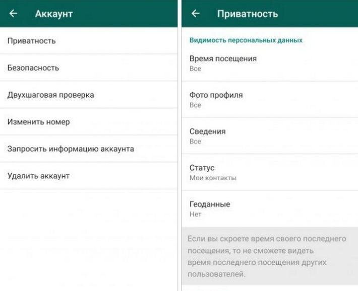 В разделе «Приватность» (в него можно попасть через «Настройки» – «Аккаунт») редактируются персональные данные. Только вы решаете, кто может видеть ваше фото, статус и информацию о последнем посещении мессенджера.
