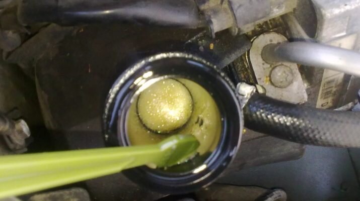 Естественно скинули в цене на замену редуктора, и редуктор я на самом деле поменял, но после прокачки снова увидел пену в бачке, капли под машиной, и после детального осмотра я долго смеялся….. более глупого и неожиданного места течи и подсоса воздуха, я никогда больше не встречал….