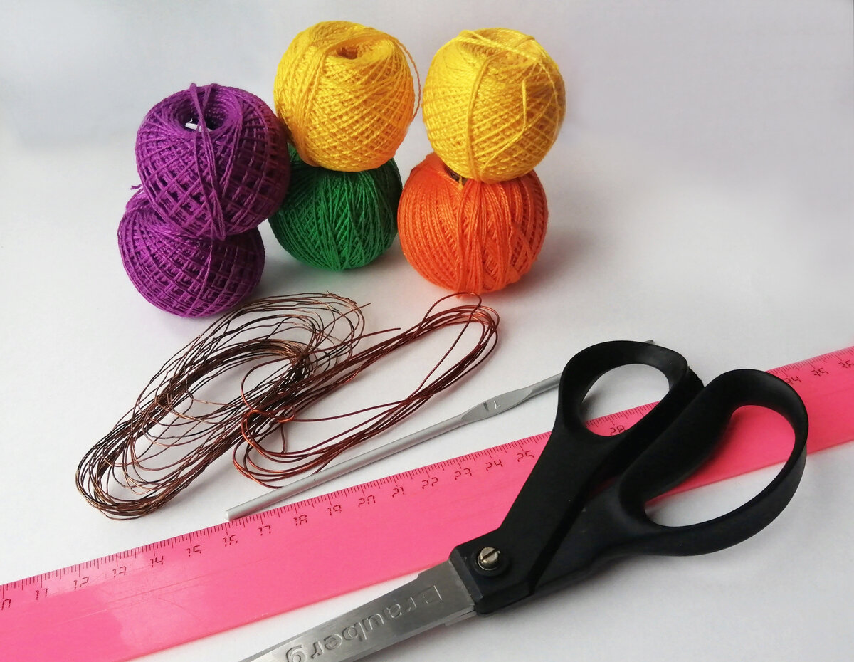 Весна идет! У вас уже светит солнышко? В моем городе уже иногда показывается :) Так к чему я это все. Появление солнца хоть и редкое, но весеннее настроение создает. И, как говориться, "если гора не идет к Магомеду, Магомед пойдет к горе". Решила я зазывать весну. Знаете чем? Конечно же своими вязалками :) Что ассоциируется у вас с весной? У меня цветы. Именно поэтому выбор пал на них. Я обожаю крокусы, поэтому без сомнений взялась за них. Идею и описание нашла на просторах интернета, и если кому-то интересно сотворить такое чудо, то в следующем посте обязательно выложу ссылку на автора - так что не поленитесь написать о этом в комментариях :) Вот что понадобится для вязания. По-моему очень скромно и бюджетно :) Итак, "ингредиенты" таковы: • ниточки "ирис" - желтый, фиолетовый, оранжевый и зеленый • крючок №2 • проволока диаметром 0,5 мм и 1 мм • линейка - для удобства 40 см и более • ножницы Вот и все! Я приступила к вязанию. В общем-то состоит букетик из повторяющихся элемент