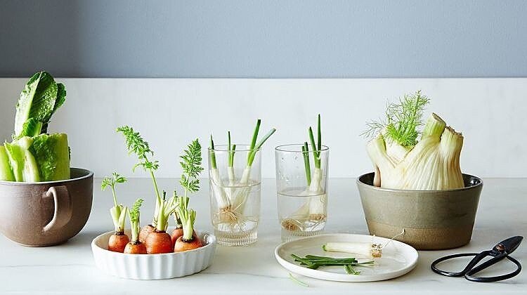 Замечательно выгоняются на воде такие культуры как китайская капуста бок-чой (пак-чой), листовой сельдерей, кочанный салат, лук-порей, лимонное сорго, фенхель. Подход тот же самый: налейте в емкость немного воды и поместите в нее обрезанную часть растения. В случае с перечисленными культурами - корневой частью в воду.