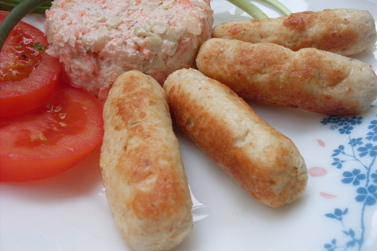 Домашние куриные сосиски — отличная замена магазинным, изобилующим крахмалом, глютаматом и прочими ненужными добавками. Особенно рекомендую их детям-аллергикам и диабетикам, для которых вышеперечисленные ингредиенты представляют угрозу. Всем остальным предлагаю просто приготовить хотя бы раз, чтобы разнообразить свое меню. Ингредиенты: Куриный фарш - 600-700 гр. Яйцо — 1шт Сливки — 100 мл. Соль, перец или другие специи по желанию. 30 гр размягченного сливочного масла Лук — 1шт (опционально, диабетикам не рекомендую) Готовим: 1). В готовый фарш добавляем яйцо, сливки, соль, специи, масло. Хорошо перемешиваем. Если у вас целое куриное филе, можете все ингредиенты смешать в блендере. 2). Раскладываем на плоской поверхности обычную пищевую пленку. Выкладываем на край пару столовых ложек фарша. Закручиваем его как конфетку несколько раз, при этом хорошо утрамбовывая. Отрезаем пленку ножом. 3). По краям «конфетки» с обеих сторон завязываем узелки. Я иногда добавляют полоску сыра