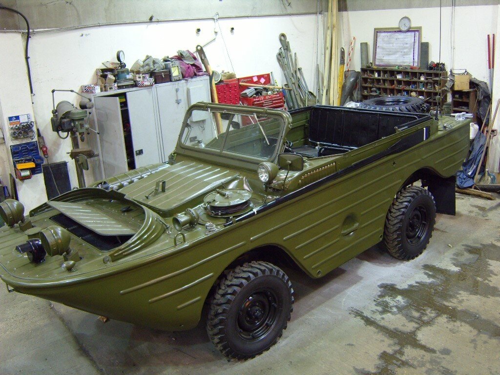 Здравствуйте мои дорогие читатели, хочу рассказать вам об Амфибии ГАЗ-46. Зачем нужна была такая техника советской Армии? До времен Великой Отечественной Войны, в СССР не было таких машин-амфибий. Тем самым пришлось позаимствовать в период войны "амфибию" у американцев. Это были Легковой Ford GPA и грузовой автомобиль DUKW, как вы понимаете это были первые водоплавающие военные автомобили в СССР. Характеристики амфибии. Весил автомобиль 1280 кг, грузоподъемность до 500 кг. Двигатель установлен бензиновый 2.1 литра, мощностью 55 л.с. Максимальная скорость на суши 90 км/час, по воде ГАЗ-46 мог передвигаться почти 10 км/час. Привод 4X4. Машина разрабатывалась исключительно для армии СССР для разведки в тяжелых условиях. Выпускаться автомобиль начал 1953 году. В наше время такой автомобиль можно увидеть только в музеях и коллекционеров. Спасибо что дочитали пост! Поставьте лайк и делитесь мнением в комментариях. Подписывайтесь на мой блог Тапочку в ПОЛ.