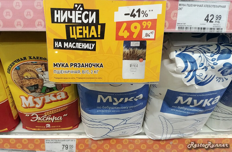 Еще одна причина, по которой я отправился в Дикси: я хотел сделать хачапури по минимальной цене и понять, насколько она отличается от рыночной и ресторанной. Начал с муки. Взял вот этут "Рязаночку", хотя на фото ее нет. Ее я нашел в метре справа, но в Дикси всегда ценники перепутаны.