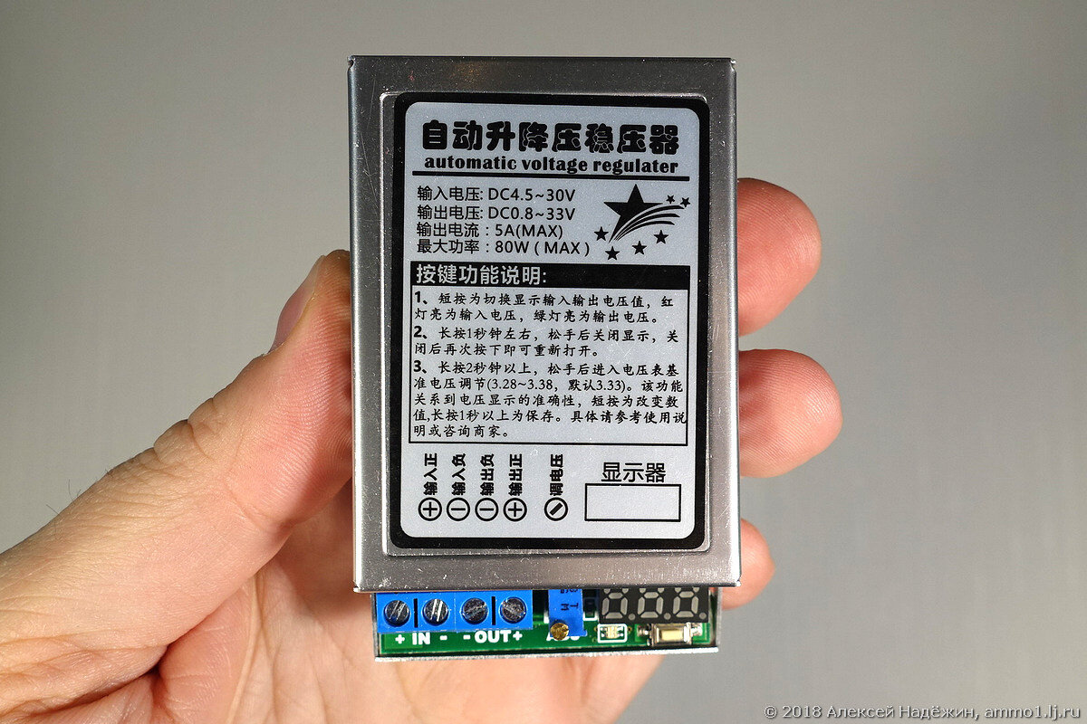 Это устройство способно выдавать на выходе постоянное напряжение от 0.8 до 30 вольт с током до 5 ампер при напряжении на входе от 4.5 до 30 вольт. Цифровой индикатор показывает напряжение на выходе или на входе.