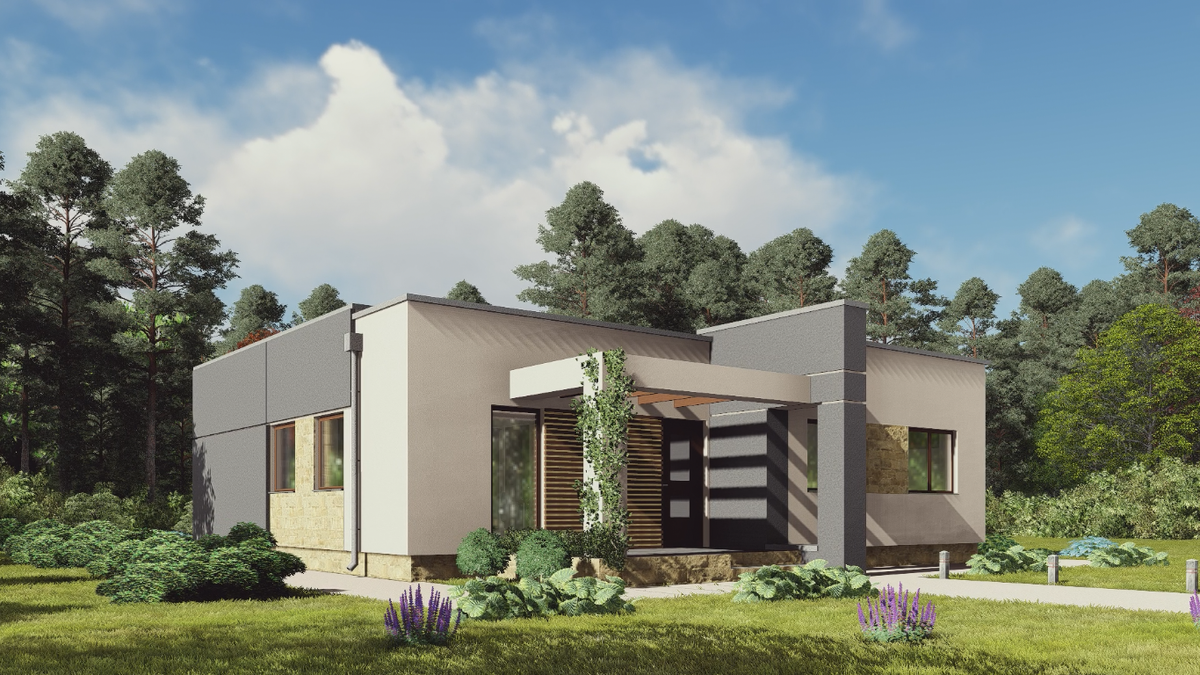 Всем привет, сегодня познакомлю Вас с проектом одноэтажного, современного дома в стиле хай-тек. Проект дома Южный. Сразу скажу, чтобы не было лишних вопросов, данный проект дома мы не разрабатывали, мы его просто визуализировали, чтобы показать нашим клиентам, что мы сможем построить такого плана дома.