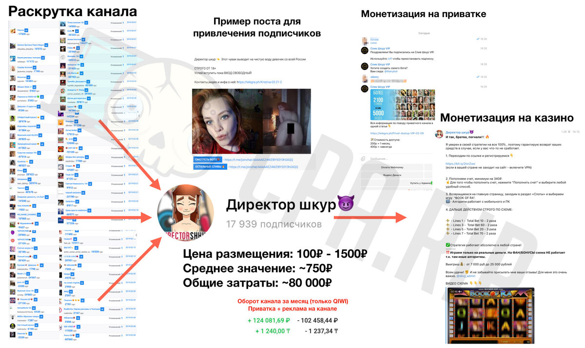 Привет! Сегодня поговорим про слив трафика из Telegram-каналов на схемы обыгрыша казино Vulcan Club. Подход который я вам сегодня покажу работает, по нему отливают прямо сейчас, на момент написания статьи. Telemetr (промокод CPARIP дает скидку 15%) — вся статистика по каналу, да и сам канал был найдет при помощи этого сервиса. Общая схема работы И так, вся схема выглядит следующим образом. Создаем канал в Telegram с «частными фотками шкур», закупаем на него трафик в других каналах. Подобного контента много, найти его не составит труда. В процессе заливки на канал подписчиков продаем доступ в «приватку» с «приватными» фотками и видео шкур, через бота. В итоге весь рекламный бюджет у нас отбивается за счет приватки + сами продаем рекламу на канале. Дальше подключаем монетизацию на Gambling. Ссылка на канал из этого кейса в конце статьи. Общая схема работы: Раскачиваем Telegram-канал Создали канал, сделали на нем 3-5 постов, уже можно продвигать. С самого начала берем мощный старт, тут