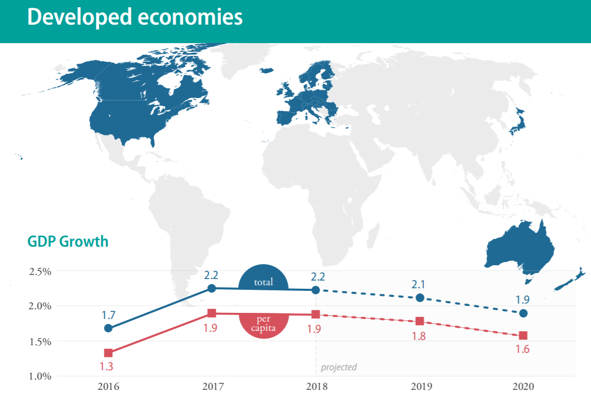 Данная инфографика представляет из себя показатели взятые из последнего доклада ООН по экономическому состоянию регионов и групп стран мира. На первой картинке показан общий рост экономики (синяя линия) и рост ВВП на душу населения (красная линия) за 2016-2018 годы среди группы стран мира относящихся к "развитым странам", так же приведены прогнозные показатели на 2019 и 2020 годы. Здесь нужно отметить, что данное разделение принятое в докладе ООН не совсем отражает действительность. В частности в "развитые экономики" попадает Япония но не попадает Южная корея, что вызывает вопросы. А так же в них попадает ряд стран юго-восточной европы включённые в эту группу явно из политических соображений (принадлежности к Европейскому союзу) не смотря на не самые высокие показатели ВВП на душу населения. Далее идёт средний показатель ВВП на душу населения для данной группы стран выделенный слева и структура экспорта данной группы стран справа: Далее идёт группа стран с "переходной