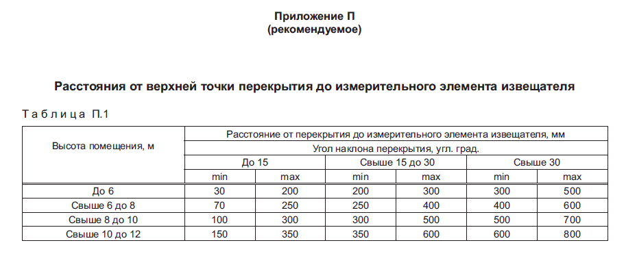 Теперь все прозрачно и ясно – в обычном помещении высотой до 6 метров, при просто горизонтальном перекрытии без всяких уклонов, то есть если следовать таблице с углом наклона перекрытия до 15 градусов, следует выдерживать расстояния от пожарного извещателя до уровня перекрытия от 3 до 20 сантиметров. Если высоты другие – читаем табличку ниже и действуем по писанным в ней указаниям.