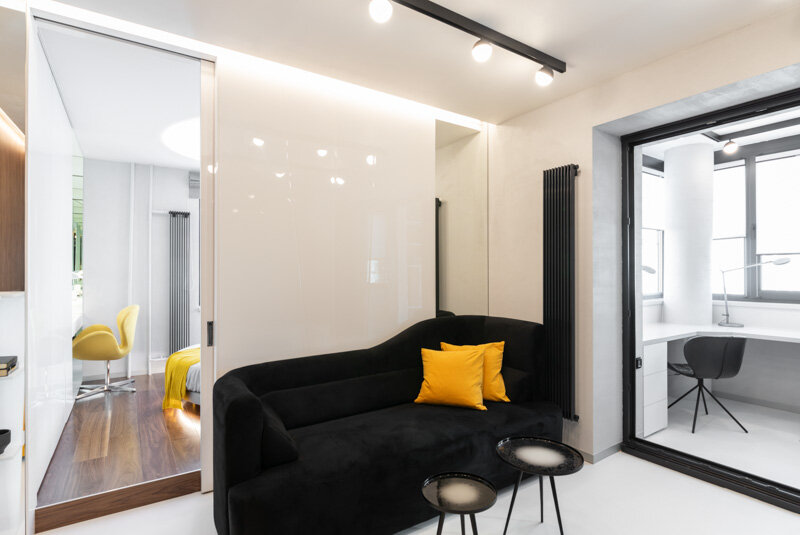 Вход в гостиную и в спальню выполнен через высокие и достаточно широкие перегородки до потолка. Их можно полностью раскрыть, частично объединив различные зоны. А выход на балкон реализован за счет теплой перегородки-гармошки, позволившей соблюсти нормативы по присоединению балкона, которая в сложенном состоянии почти полностью паркуется в толщине проема стены. Она прозрачна, и предполагается, что почти всегда будет открытой, закрываясь только тогда, когда в офисной части необходимо поработать в тишине. Таким образом гостиная и балкон получаются визуально объединены, а их суммарная площадь приближается к 17 кв.м., что позволяет не чувствовать себя стесненно.