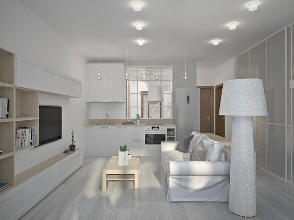 Нейтральные светлые тона и простые очертания мебели нивелируют сложную планировку, создавая ощущение приятной простоты. Взятый за основу чистый белый цвет позволяет сохранить как можно больше света. Массив светлой древесины – от выбеленного оттенка на полу до столешниц золотистого тона – «утепляют» интерьер. Выдержанные в общей стилистике кухонный гарнитур и мебель под TV визуально объединяют обе зоны. Мягкая группа создает ощущение уюта, а необычный торшер с перфорацией акцентирует на себе внимание. Островная перегородка-комод за диваном зонирует гостиную группу и увеличивает место для хранения.