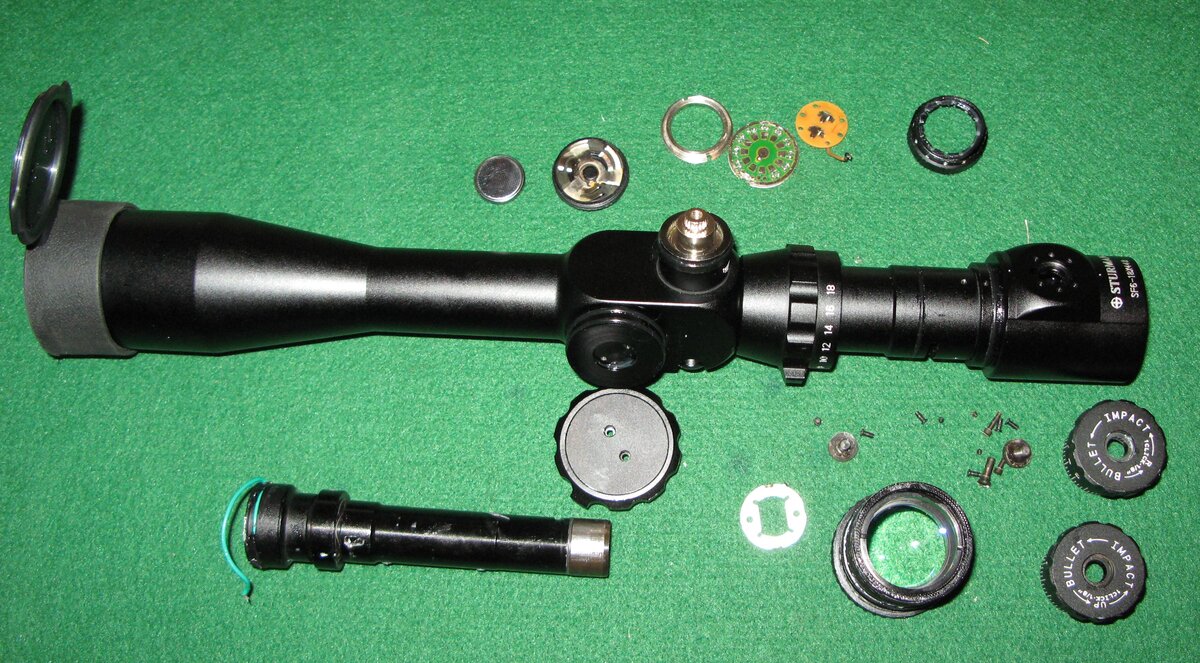Исходя из устройства, стало ясно, что поворот марки, которая к слову представляет из себя две тонкие проволочки, натянутые в пустоте, произошло из за его слабой фиксации тремя боковыми винтами (их вполне можно затянуть не разбирая прицела) и трансфокатор ее просто свернул. Устройство же самого прицела не отличается оригинальностью, хорошо понятно из фотографий и является удачной компиляцией из дорогих прицелов. Что еще можно сказать, порадовал кондовый корпус, толстый, монолитный и прочный, сломать его будет нелегко.