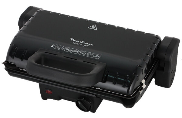 Электрогриль небольшого размера с металлическим корпусом, удобным и простым управлением и весьма привлекательной ценой. Недорогой электрогриль появился на рынке относительно недавно, тем не менее благодаря прибор уже стал весьма популярным среди потенциальных покупателей. Для начала перечислим его характеристики: Потребляемая мощность: 1600 Вт Варианты использования гриля: открытый/закрытый Рабочая поверхность гриля: верхняя/нижняя Материал рабочей поверхности гриля: металл Регул. температуры нагрева: Да Материал корпуса: нерж. сталь Рифленая пластина для гриля: Да Регул. наклона раб. поверхности гриля: 2 положения Индикация: включения, готовности к работе Длина сетевого шнура: 0.9 м Цвет: черный Вес: 3.4 кг Высота: 18 см Ширина: 33 см Глубина: 29 см Moulinex GC208832 действительно отличается от большинства подобных моделей своими габаритами. Она имеет достаточно вытянутую вширь прямоугольную форму. Благодаря компактности этот электрогриль не занимает много места даже на небольшой
