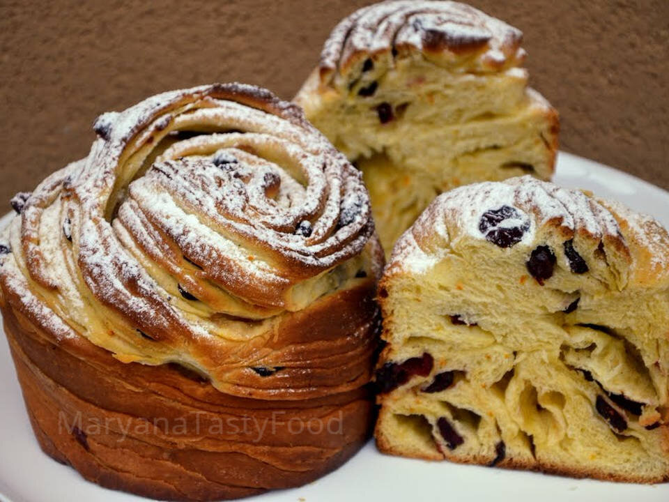 Ингредиенты: Как приготовить В теплом молоке развести дрожжи и 1 чайную ложку (10 грамм) сахара. Поставить в теплое место, подходить. На водяной бане растопить 40 грамм сливочного масла. Яйца, желтки, сахар и ванильный сахар взбить миксером в светлую пышную пену. На стол просеять муку и сделать в центре углубление. Влить дрожжевую смесь, затем яичную, добавить соль, перемешать. Добавить растопленное сливочное масло, замесить тесто. Вымешивать тесто не менее 10 минут, пока оно не перестанет липнуть к рукам. Убрать тесто в теплое место без сквозняков на 1-1,5 часа. Изюм промыть и залить кипятком на 15 минут, затем обсушить бумажным полотенцем. Растопить оставшееся сливочное масло на водяной бане. Готовое тесто разделить на 3 части. Скатать каждую часть в шарик и дать постоять 10 минут. Затем раскатать каждую часть в очень тонкий прямоугольный пласт. Смазать тесто сливочным маслом. Посыпать изюмом и миндалем. Свернуть в рулет и убрать в теплое место на 30 минут. Затем рулет