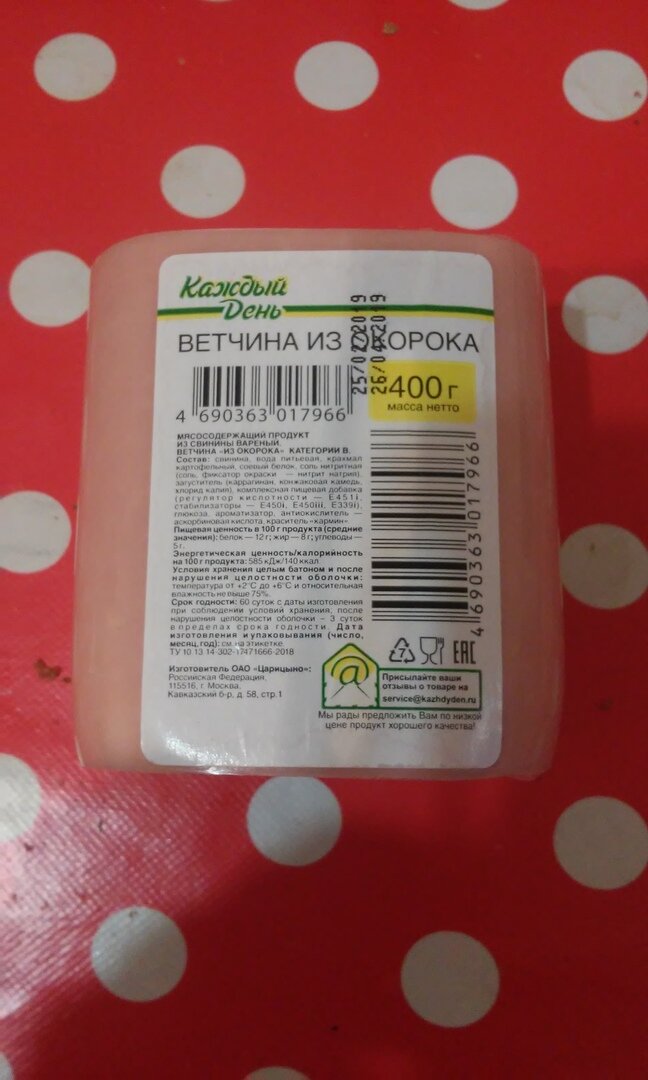 Ветчиной называется продукт из кусков бескостного мяса, подвергнутый посолу с использованием массирования, созреванию и варке с целью создания монолитной структуры и упругой консистенции в готовом продукте. Это так в госте написано. Были в Ашане в очередной раз и нашли на полках случайно ветчину торговой марки "Каждый день". Удивилась, присмотрелась - ветчины было три вида: из окорока ( 69 рублей), из свинины (72 рубля) и индейки (76 рублей) и это за 400 грамм, приличный кусочек за небольшие деньги, решили взять для начала из окорока. А еще ветчина не калорийная, всего 140 Ккал!!! В общем перед фотканьем, я не удержался и попробовал его, отрезал там, где не было этикетки. Простите, шопинг измотал)) Уже дома прочитали состав с женой и были немного шокированы его объемами и насыщенностью всякого непонятного. Супруга порезала для бутерброда, попробовали - пойдет. Через некоторое время все хотели очень сильно пить и не могли напиться. Видимо это из-за состава, всяких глутаматов. На второ