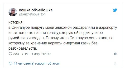 Недавно пользовательница твиттера рассказала историю о том, что подругу ее знакомой якобы расстреляли в аэропорту Сингапура за хранение наркотиков. Но люди ей не поверили. В Сингапуре действительно предусмотрена смертная казнь, но не за хранение, а за распространение наркотиков (и то есть смягчающие обстоятельства: если человек докажет, что был только курьером, то его не казнят, а посадят). К тому же казнят в Сингапуре через повешение. Представить расстрел без суда и прямо в аэропорту вообще довольно сложно. В общем, эта странная история не вызвала доверия, но зато из нее родился новый флешмоб: люди придумывают из-за чего могут расстрелять в разных странах. Получается смешно. Привет, если вам понравилась статья — жмите лайк сбоку и подписывайтесь на канал. Так мы будем на связи и вы не пропустите крутые публикации. А если хотите написать отзыв или совет, пишите на почту основателя проекта SNTCH.com Дарьи: daria@snatchnews.com