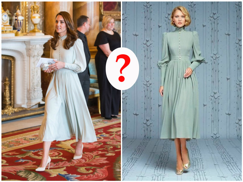 5 марта состоялся прием в Букингемском дворце, посвященный 50-летию принятия Принцем Чарльзом титула Принца Уэльского, мероприятие проводилось лично Королевой Елизаветой. Среди гостей присутствовали герцоги Кембриджские и Сассекские. Герцогиня Кетрин выбрала для приема элегантное платье мятного оттенка, классический силуэт которого напомнил моду викторианской эпохи. Однако внимание поклонников привлекла не утончённость наряда и дань традициям, а тот факт, что платье удивительно похоже на идентичный наряд из коллекции русского дизайнера. При этом дворец прокомментировал, что платье сшито личным портным герцогини на заказ, поэтому вопрос авторства остается открытым. Пользователи провели целое расследование, предположив несколько вариантов. Итак, официально было заявлено, что платье сшито на заказ частным портным, имя которого не разглашается (по предположениям это Sarah Burton или Angela Kelly). Однако можно заметить несколько очень похожих нарядов. Во-первых, во время Королевского Тура