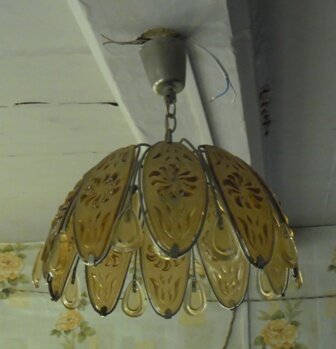 Мне досталась от свекрови в наследство вот такая обычная, советская, тяжелая, я бы даже сказала фундаментальная люстра. У нее очень много недостатков: В связи с этим я решила ее преобразить. 1.Снимаем одну стеклянную деталь. 2.Обводим ее на бумаге так, чтобы получилась выкройка. 3.Вырезаем получившийся шаблон. 4.На шаблоне делаем карандашом разметку для дырок. 5.Делаем еще несколько шаблонов. Складываем лист бумаги по размеру шаблона. Я сложила лист втрое. Обвела шаблон. Иголкой перенесла разметку дырок сразу на все шаблоны, прокалывая насквозь. Лучше это делать на пенопласте или газете, чтобы не испортить поверхность стола. 6.Вырезаем шаблоны по контуру. Получилось сразу несколько шаблонов с дырками. 7.Тяжелые стеклянные детали я решила заменить лёгкими, пластиковыми. Для этого я использую пластиковые бутылки. Бутылки заранее подготавливаем – промываем и удаляем этикетку. Обои на даче у меня зелёные с желтыми цветочками, поэтому я возьму бутылки мятного цвета. 8.К бумажному шаблону