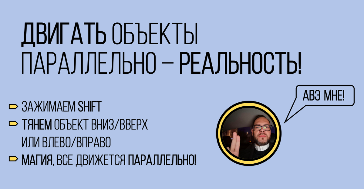 Признайтесь, мучались ведь, да))? То немного левее, то немного правее нужно взять - и все равно не получается переместить объект ровно! Кнопка SHIFT поможет нам в параллельных перемещениях. Как в вертикальных, так и в горизонтальных, но не более)! С зажатым SHIFTом, выбранный объект перемещается точно по горизонтальной или вертикальной траектории)! Удобно, просто и со вкусом! Понравилось? Тогда жду "палец вверх" на публикации))! Читайте также: Лайфхак "квадрат" и "круг", Красивые презентации стандартными фигурами?