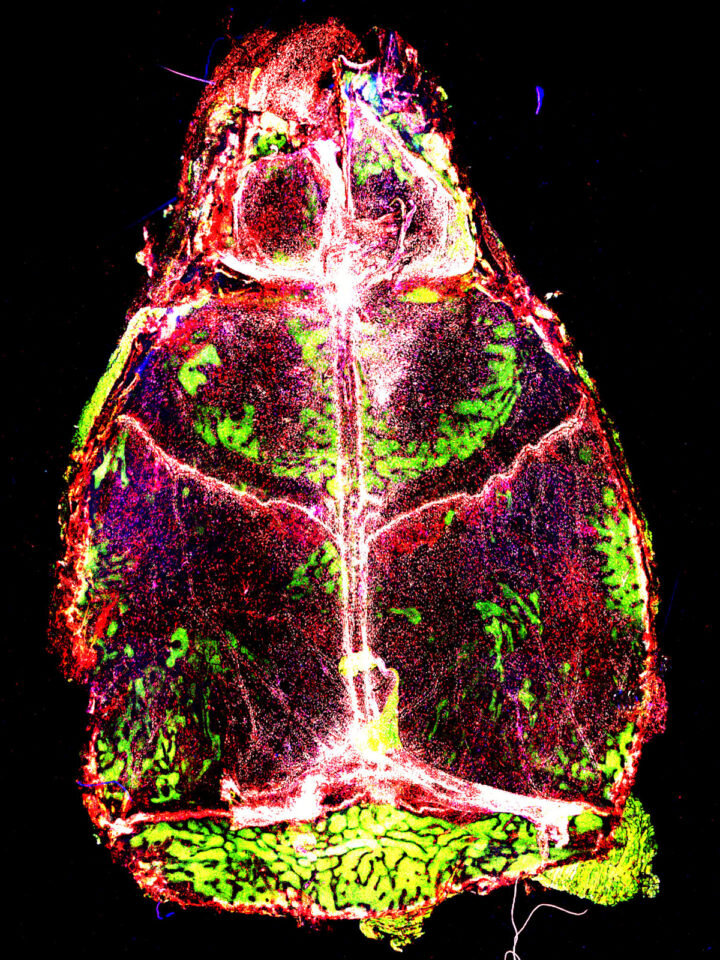Красные, синие и белые точки — это макрофаги мозговых оболочек, менингиальные макрофаги мыши. Они находятся в постоянной готовности к потенциальным угрозам для мозговой ткани. Менингиты — группа серьезных заболеваний, которые поражают оболочки мозга — оставляют свой след и могут повлиять на способность организма бороться с такими инфекциями в будущем. Согласно новому исследованию, опубликованному в Nature Immunology, инфекции могут оказывать длительное воздействие на популяцию менингеальных иммунных клеток, заменяя их клетками, происходящими извне мозговых оболочек, которые затем изменяются и становятся менее способными распознавать и предотвращать будущие атаки.
