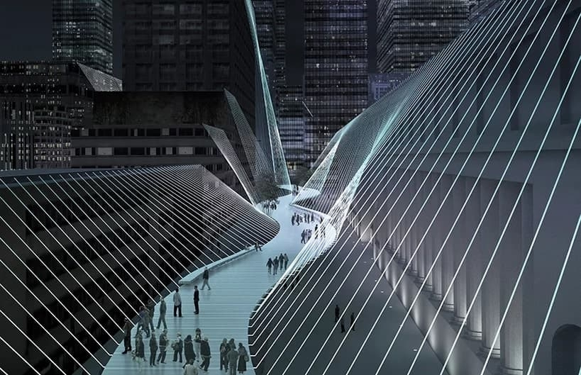 Бюро Lissoni Architettura разработало проект уникального пешеходного моста. Он свяжет небоскребы Манхэттена и новый вокзал и будет подвешен между зданиями на высоте 6 метров. Протяженность моста составляет около 600 метров. Единственный связующий элемент между мостом и землей — вертикальные дорожки с лифтами и лестницами. Они находятся в стратегически важных точках, где людям наиболее удобно спускаться и подниматься. Одна из магистральных идей проекта — спроектировать не просто подвешенную дорогу, но и предложить принципиально новую видовую точку на город, причем сделать это с минимальным вмешательством в городской ландшафт. Мост действует как живой организм, прихотливо изгибаясь и адаптируя форму под окружающие здания. Легкая структура состоит главным образом из стальных кабелей, снабженных органическими светодиодами (OLED technology). В дневное время мост служит пешеходным звеном, а в ночное превращается в эффектную световую инсталляцию. Детали: Источник Архитектура и дизайн