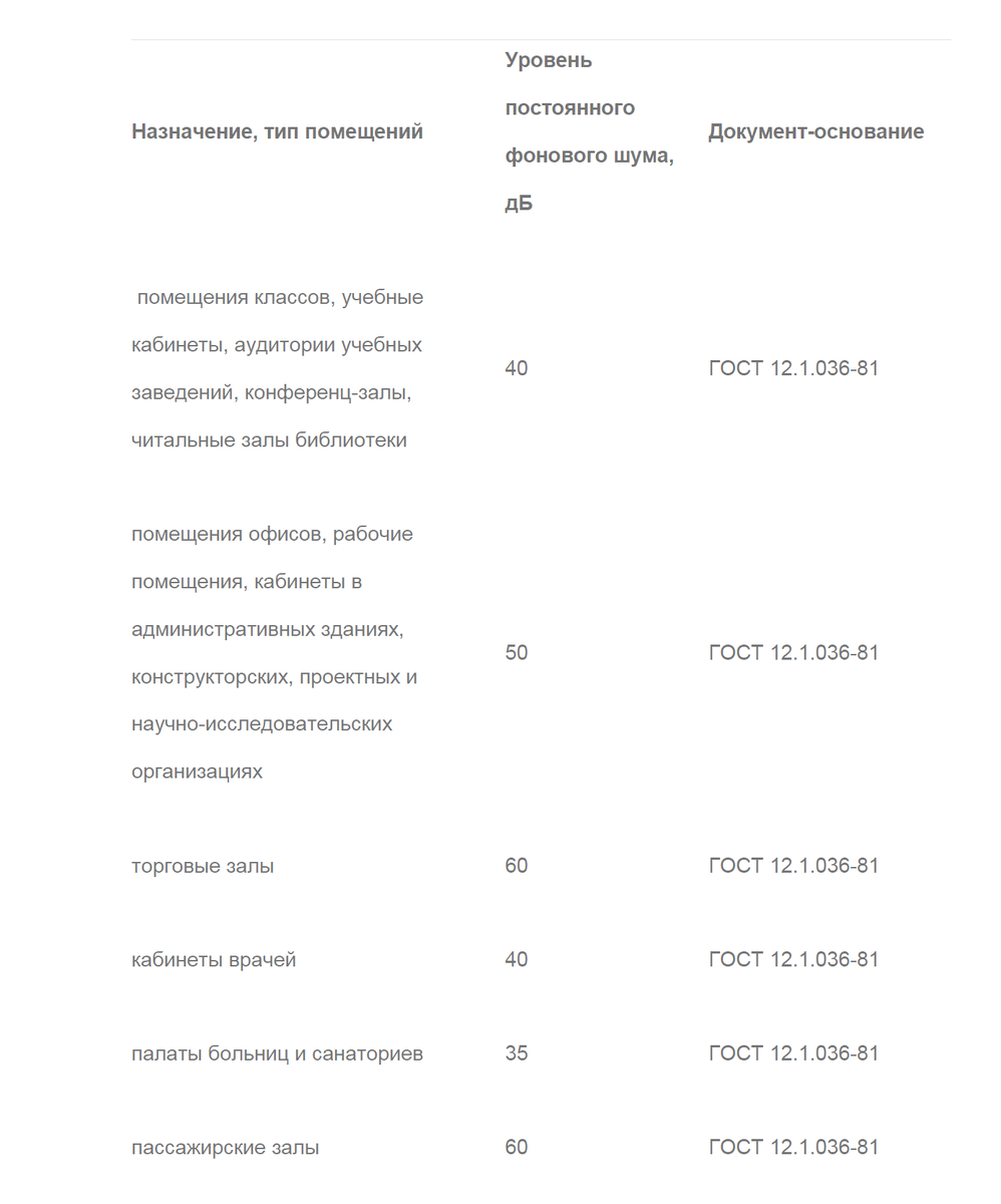 Для начала, надо сказать, что необходимо не лениться и все таки выполнить расчет звукового давления (хотя бы для себя, если Заказчик не настаивает на прикладывании расчета в состав проектной документации). Для этого, если объект находится в черте Вашей досягаемости, неплохо было бы самостоятельно отправиться на объект и замерить уровни фонового шума в нескольких самых критичных местах. Если объект находится где то далеко или он вообще еще не существует – находится в стадии строительства, то предлагаю Вам воспользоваться существующими таблицами типовых предельных значений шумов, которые я привожу ниже. Вполне возможно, что в результате, реальные фоновые шумы будут реально отличаться от приведенных в таблице, но это все таки лучше чем вообще ничего. Всего три столбца – первый назначение помещения, второй – предельный уровень фонового шума и третий – ссылка на ГОСТ или другой документ, в котором этот предельный шум установлен. Думаю расчет звукового давления, при наличии указанных данных, будет обоснован намного более надежно, чем просто прикидка “на глазок”.