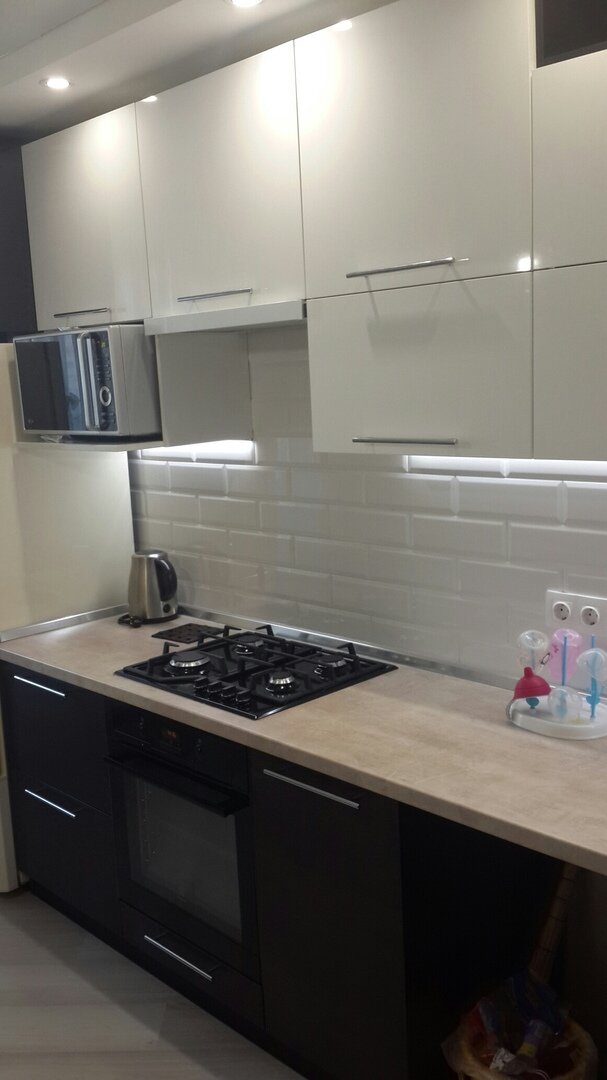 Всем привет, сегодня мне прислали очень интересую кухню из Красноярска. Автор очень кратко описал свою работу, да еще говорит и не закончили до конца, хотя лично я вижу что кухня уже закончена, возможно только нет обеденной зоны, но гарнитур сделан по моему мнению на пятерку. Если вам понравится кухня, не пожалейте поставить палец вверх, вам это секунда, а мне и хозяину этой кухни будет очень приятно. Ремонт на кухне это всегда море креатива и желания уместить все что только можно на той площади, что есть, и данная кухня как по мне, вполне вмещает в себя все необходимое, и несмотря на это, выглядит очень просторной и комфортной. Обожаю контрасты, и когда мы готовили с супругой идею для нашей кухни на площади 11кв.м, мы то же захотели сделать не однотонную, вот не нравятся мне когда кухня просто белая или черная, у вас я видел уже много таких, и по этому решил отправить свою работу, тем более что делал все своими руками, только гарнитур заказал, а собирал сам. Во первых, сделал подсветк