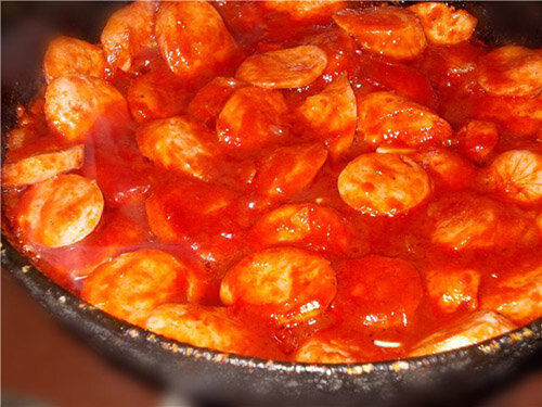 Сытное, согревающее, брутальное и жизнеутверждающее блюдо – ярко-красный душистый соус, упругие сочные сосиски, легкая кислинка томата оттеняет горячий мясной жир. Даже без добавления специй и пряностей аромат этого блюда способен пробудить к жизни уставшего, замерзшего или «не рассчитавшего свои силы» человека, как это случилось со Степой Лиходеевым. Для более традиционного варианта можно воспользоваться томатной пастой, разведенной водой, для более современного – резанными помидорами в собственном соку. В любом случае, это уже готовые консервы, не требующие дополнительной обработки, просто открыть банку и добавить ее содержимое к сосискам, которые можно порезать кусочками или оставить целиковыми. Даже лаконичный вариант: сосиски + томат, необыкновенно вкусен, но можно обогатить его и добавлением любимых специй: перца душистого и горошком, лаврового листа, сушеной или свежей зелени, а для большей остроты влить немного лимонного сока или огуречного рассола, или для эстетов - белог