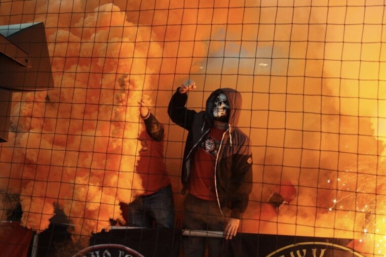 Есть такая штука вроцлавский огонь вроде бы,бочка с порохом.Столб огня на метр и брызги.У меня было в руках две и у одной отвалилось дно спалив мне всю левую руку.Боль была адская и сотрудники полиции с радостью вычислили и поймали меня,каково же было моё удивление когда девушка ни с того ни с сего сказала что она со мной и что я жертва хулиганов.С трудом но полицейские купились на эту байку и отпустили нас за пределы стадиона.