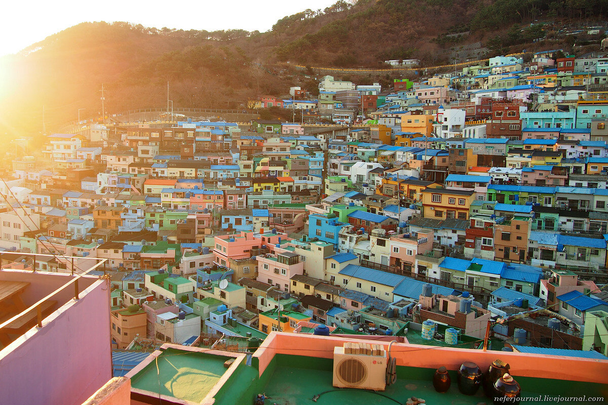 Колоритный райончик, просто MUST SEE. Когда увидела фотографии, то сразу же поставила на карте флажок, я точно знала, что мне туда надо. Разноцветные домишки построены на горе, практически вплотную друг к другу. Улиц нет, только узкие проходы между домами. Причем маленький дворик рядом с крыльцом это крыша дома на нижнем ярусе. В Камчхоне селились беженцы из северных регионов Кореи. Район был бедным и неблагополучным. Теперь его облагородили и сделали культурной достопримечательностью.