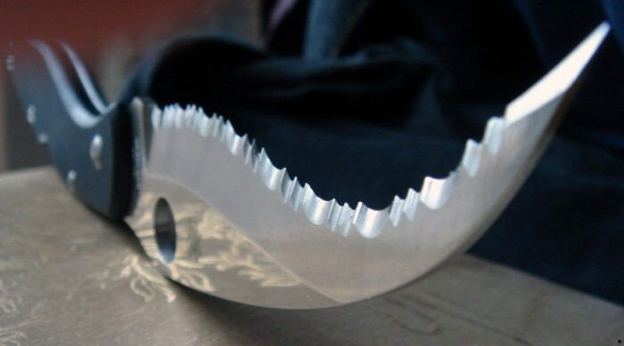 Серрейтор - тип заточки ножа, при котором лезвие имеет волнообразную форму режущей стороны. В отличие от пилы, заточка выполнена в одной плоскости, что позволяет резать дерево без большого числа опилок. В отличие от того, какую площадь занимает серрейторная заточка, различают полные серрейторы и полусеррейторы. Где применяется Такой вид заточки нашел большое применение в туристических, боевых ножах, а также ножах для самообороны и стропорезах. Также ее можно увидеть на одноразовых пластиковых ножах. Пластик - довольно мягкий материал, и ему нужен серрейтор, чтобы была возможность резать пищу. Плюсы и минусы Главным плюсом такого типа заточки является то, что нож может хорошо войти в материал, который необходимо резать. Если лезвие ножа затупилось, то с серрейтором можно дольше и эффективнее использовать нож без затачивания. Благодаря устройству заточки, нож может эффективно резать сложные волокнистые материалы. Серрейтор имеет и ряд недостатков. Например, при резке вязких материалов, в