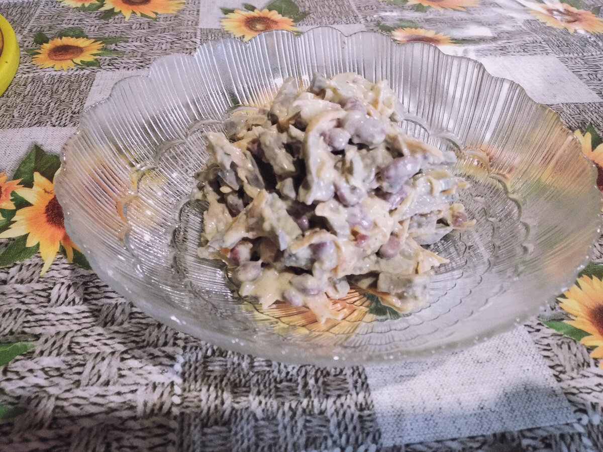 Достаточно простой рецепт салата из печени. Салатик очень сытный и вкусный. Продукты доступные. Ингредиенты: свиная печень - 500 грамм; консервированная фасоль - 1 банка; лук - 1 средняя головка; морковь - 1 средняя; соль - по вкусу; чёрный молотый перец - по вкусу; майонез; сливочное масло - для жарки. Печень промыть, залить холодной водой. Поставить на огонь. Если образуется пена, то снять её шумовкой. Когда вода закипит, необходимо печень немного подсолить, накрыть крышкой и варить до готовности (минут 40-45). Печень охладить. Лук очистить и нарезать полукольцами. В сковороде растопить сливочное масло, выложить лук. Морковь очистить и потереть на крупной тёрке . Морковь отправить к луку. На маленьком огне довести до готовности моркови (она должна стать мягкой). Лук и морковь остудить. Фасоль выложить в салатник. Обязательно попробуйте её: она должна быть мягкой, иначе салат будет испорчен. Остывшие лук и морковь добавить к фасоли. Печень порезать небольшой соломкой. И отправить