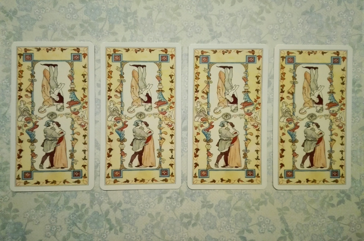 1. Подумайте о мужчине, который молчит. 2. Остановитесь на одной их четырёх позиций! Одна из 4 карт расклада поможет вам это понять. 3. За ответами листайте ниже! ОТВЕТЫ: