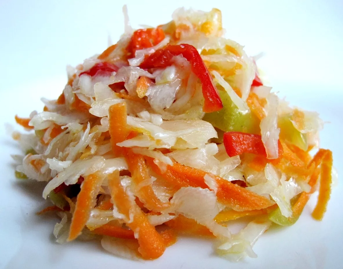 Предлагаю очень подходящий к зимнему времени года - рецепт быстрой маринованной капусты. По этому рецепту можно мариновать цветную капусту, пекинскую или, как, в данном случае, белокочанную. Цветную капусту разбираем на соцветия, а пекинскую и белокочанную – режем соломкой или кусочками. Капуста – кладезь витаминов, которые так необходимы нашему организму, так что не стесняйтесь и присоединяйтесь, будем готовить… Время приготовления – 32 минуты и ночь для маринования. Порций – 8. Ингредиенты: · Капуста белокочанная – 1-1,2 кг, · Морковь – 1-2 шт., · Чеснок – 3-5 зубцов. · Для маринада: · Вода – 500 мл, · Сахар – 100 гр., · Соль – 1 ст. ложка с верхом, · Лавровый лист – 1-2 шт., · Черный перец горошком – 8-10 шт., · Уксус (9%) – 100 мл, · Подсолнечное масло – 100 мл. Способ приготовления: 1. Подготавливаем продукты: 2. Выбираем красивую, белую и сочную капусту. А затем шинкуем ее при помощи специального ножа, тогда она будет нежная и пушистая. 3. Морковь чистим и трем на терке (мож