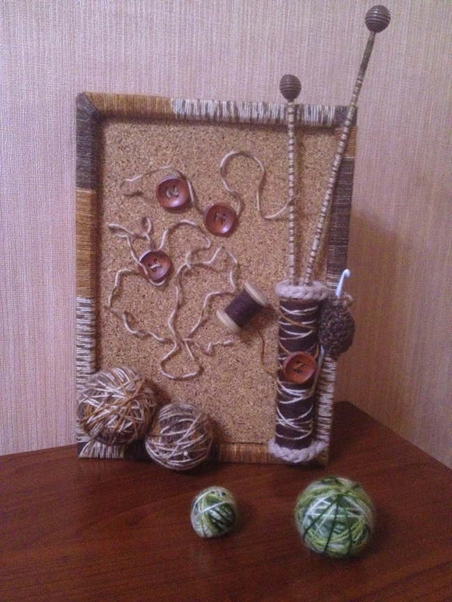 Панно из ниток для вязания. Панно (по своему определению )- вид монументального искусства , произведение декоративного характера ,предназначено для заполнения каких –либо участков стены. На сегодняшний день пользуется большой популярностью. При помощи панно можно стильно украсить любой интерьер как в квартире, так и в офисе. Мой вариант панно больше подойдет для любительниц шитья и вязания… Для своей работы я использовала: рамку для фото , за фоновую основу взяла пробковую подстилку (в основном используется как подложка под ламинат),шерстяные нитки (пряжу),все те же самые (как в предыдущей статье ) новогодние шарики (для создания клубков), крючок для вязания, деревянные пуговицы, трубку от использованной фольгированной бумаги для запекания (большая «катушка»), деревянные шпажки с бусинами (послужили для создания спиц),катушка для ниток, ну и конечно же… клей (я как всегда использую «Титан») и ножницы. Глядя на фото, не сложно догадаться как выполнена работа… 1.Для начала обклеивае