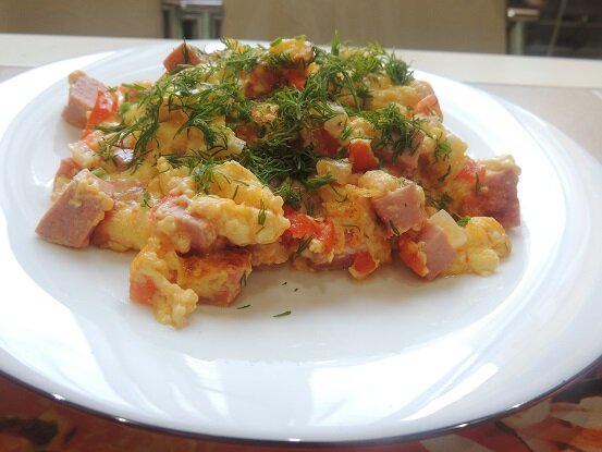 Если завтрак быстро нужен, а времени на его приготовления нет. То очень вкусный омлет с помидорами, луком и колбасой как нельзя кстати. Я, как и многие, часто не успеваю позавтракать. Так как в будни на это просто не хватает времени, и можно было бы пораньше встать, но где взять силы воли. Ведь самый сладкий сон именно под утро. Сегодня у меня для вас очень простое блюдо на завтрак в виде омлета, на приготовление которого уйдет минимум 15 минут. Для приготовления 1 порции понадобится: Луковицу, помидор и колбасу нарезаем на небольшие произвольные брусочки. С помидора я не стала снимать кожицу. Хотя если есть желание, то обдайте его кипятком, и кожица слезет, как чулок. Обжариваем все ингредиенты, на растительном масле, периодически помешивая. Куриные яйца промываем, разбиваем в глубокую миску. Добавляем соль. Взбиваем все до однородной массы. Затем вливаем немного молока. Отправляем яичную массу к уже обжаренным овощам. Накрываем блюдо крышкой и готовим до готовности. Омлет с помидо