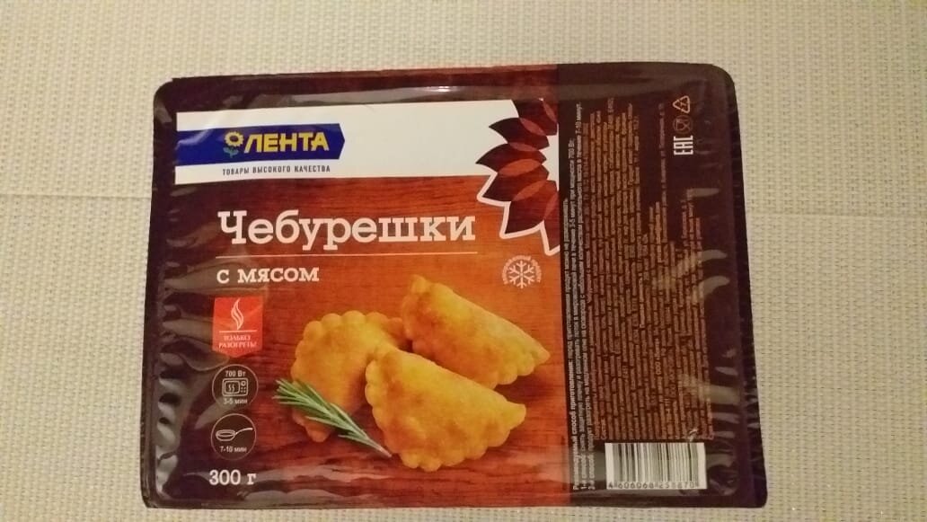 Обзор из "Ленты". Мнение покупателя на полу-фабрикат "Чебурешки с мясом" купленный в супермаркете "Лента". Здравствуйте уважаемые любители вкусно поесть. Зайдя сегодня в "Ленту" у меня было конкретное желание, найти что ни будь подходящее на завтрак, признаться бутерброды и яичница, как то слегка поднадоели и захотелось порадовать себя чем ни будь новеньким и вкусненьким, тут я увидел симпатичную упаковку с надписью "Чебурешки с мясом", сперва я подумал, что это просто маленькие чебуреки которые надо жарить, но присмотревшись понял, что это полу-фабрикат, а так как жарить чебуреки(для меня лично) занятие довольно муторное, то способ приготовления "Чебурешек с мясом" меня порадовал, всего то надо положить их в микроволновку, поставить мощность на 700Вт и подержать их в ней 3-5 минут, так же можно разогреть на сковороде в течении 7-10 минут, что в принципе то же не долго, согласитесь, что получить полноценный, вкусный завтрак за 5-10 минут очень хороший результат, экономит массу времени,