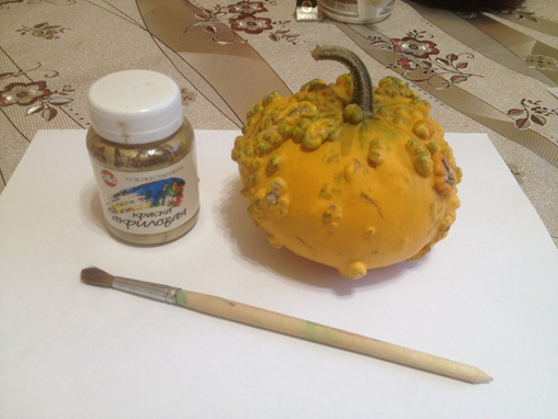 Красим декоративную тыкву…. Перед тем как приступить к дизайнерским решениям, декоративную тыкву нужно правильно подготовить , а именно хорошо высушить. Сушка делает тыкву настолько жесткой, что она прослужит Вам долгие годы. Для начала мы отберем несколько плодов, лучше с запасом (количество будет зависеть от придуманной Вами композиции). Тыква должна быть полностью здоровой : без признаков гниения и плесени, достаточно твердой и обязательно иметь плодоножку. Важно! Не выбирайте крупные плоды. Это усложнит процесс сушки и хранения «поделки». Запас нужен на случай если в процессе высыхания все таки попадутся некачественные плоды. Сушить наши будущие поделки можно как техническим способом, так и естественным. Я выбрала естественный способ. Но сразу хочу отметить, что процесс этот долгий и займет несколько месяцев (как минимум три). Тыкву раскладываем в сухом месте, лучше на листе бумаги . Рядом можно поставить емкость с солью. И то и другое хорошо впитывает влагу. Время от времен
