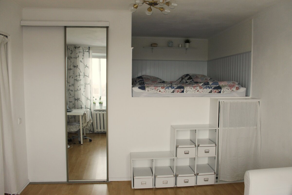 Вы все еще покупаете мебель в магазинах за огромные деньги? Тогда я расскажу вам как можно делать мебель своими руками, будучи хрупкой девушкой и не имея совершенно никаких навыков! Площадь комнаты 18 метров. Ремонт был очень экономным, все материалы куплены самые простенькие и самые дешевые в Леруа Мерлен, а все работы сделаны своими руками. Чтобы избавиться от антресолей, вечно забитых всяким хламом, и не загромождать балкон, было придумано сделать некое хранилище для вещей, которое не будет съедать много места в квартире, и было решено сделать кровать-чердак, совмещенный с гардеробной комнатой Итак, были куплена гора досок и реек, и собирается каркас для кровати, размер 180*200 см Из гипсокартона и направляющих строится гардеробная комната, примыкающая к кровати. Полки для гардеробной нарезаются из стеновых панелей. Кровать и гардеробная обшиваются снаружи гипсокартоном и обклеиваются обоями под покраску. Так выглядит гардеробная изнутри с уже развешенной одеждой. А под кровать