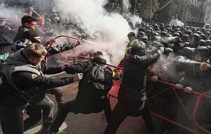И повёл парней на Банковую, к главному офису Украины. Чтобы «задать вопрос» про коррупцию. При этом было известно, что в офисе президента нет, как и вообще в Киеве. Уехал в Канев, где празднует с женой годовщину Тараса Шевченко, а затем поедет в Черкассы. Азовцы атаковали полицейских, перекрывших Банковую. Было очень похоже на события 1 декабря 2013-го. Только цепями полицию не били и бульдозером не давили. Но от души оскорбляли полицейских – били по шлемам, лепили на забрала наклейки (с перечёркнутой свиньёй), поливали полицейских «черёмухой». Не пробив стену полиции и не получив силового отпора от непосредственных подчинённых Авакова, Билецкий предложил своим бойцам ехать в Черкассы. Те с воодушевлением откликнулись, идея понравилась.