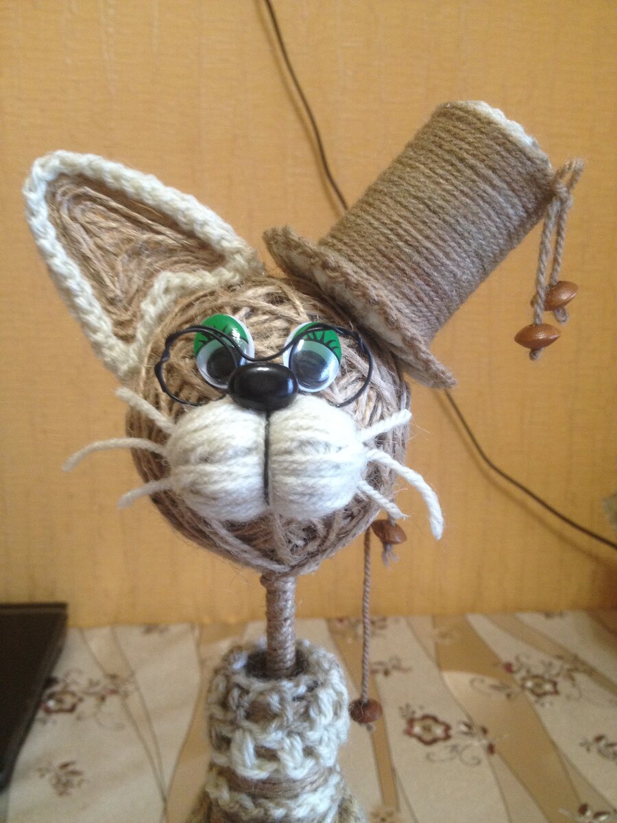 Сегодня я расскажу как сделать кота из джутовой веревки . Для этого нам понадобятся: -пустая бутылка ( форму выбирайте сами, какая понравится); Шаг.1. Джутовой веревкой при помощи клея обматываем бутылку. Шаг 2. Бамбуковую палочку клеем к шарику , в отверстие для держателя нитки ( сам держатель удаляем , он нам не понадобится) Шаг 3. Далее по накатанной схеме - обматываем веревкой Шаг 4. Ухо. Ухо рисуем на бумаге. Затем подкладываем шаблон под файл или старую ( т.к будем использовать клей) обложку для тетрадей, сверху файл по контуру будущего слухового органа промазываем клеем и начинаем прикреплять джутовую верёвку до тех пор , пока ухо не будет полностью заклеяно. Затем отсоединяем от поверхности . Ушко почти готово. Ухо у " Барсика" будет одно. Потом Вы поймёте почему....😉 Шаг 5. Головной убор. Я захотела сделать цилиндр.И в принципе не ошиблась, ,кот такой прям представительный получился ....😂 Вырезаем из картона шаблоны как на фото , если получатся чуть-чуть н
