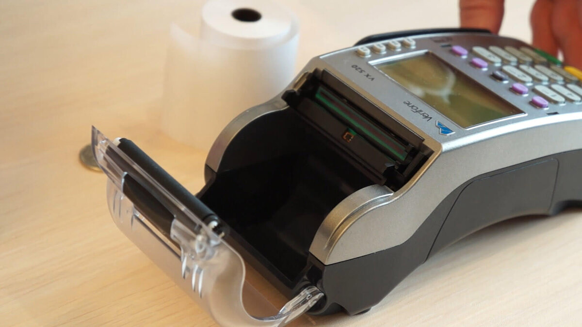 - вставляет кассовую ленту в терминал. Лента должна быть подходящей ширины. Если вы не знаете ширину ленты — позвоните в контактный центр производителя или прочитайте в инструкции к устройству.