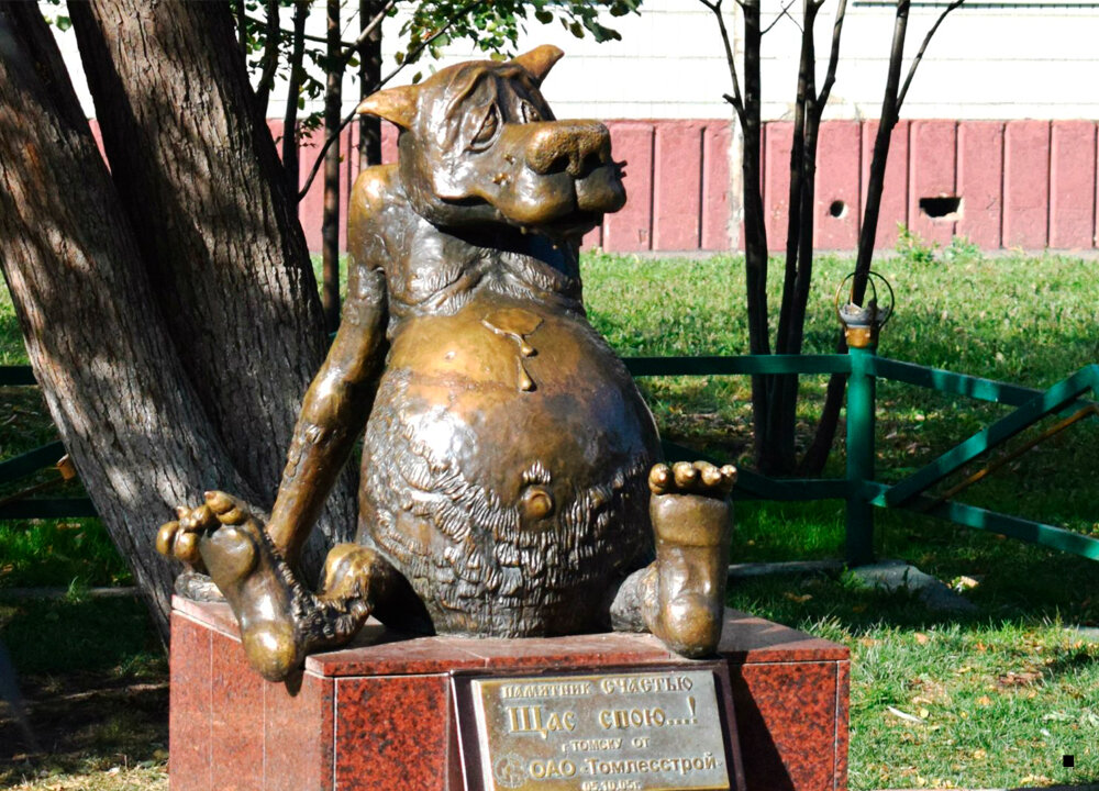 скульптор: Юлия Завьялова Идея родилась в фирме «Томлесстрой», пресс-секретарь компании придумал идею, компания выделила средства. Бронзовый волчара сделан скульптором Завьяловой как персонаж, чей образ сполна символизирует и выражает состояние полного счастья. Памятник был открыт 5 октября 2005 года. Он необычен, волк говорит, если прикоснуться к животу он выдает несколько фраз из культового мультфильма «Жил-был пес». Счастливый хищник выдает «Щас спою!» «Ну, ты заходи, если что!», «Бог в помощь». Один раз злоумышленники похитили начинку памятника, и волк замолчал, но скоро аппаратуру восстановили и за серым теперь зорко следит видеокамера. Похожая идея реализована еще в двух городах России, Ангарске и Красноярске