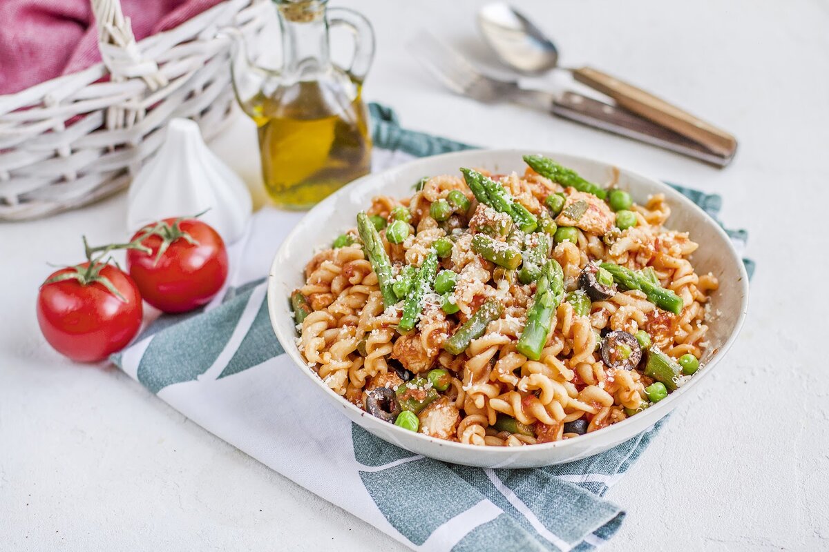 Спаржа бывает не только зеленой. Но и белой. И даже фиолетовой. Растет она очень быстро. Ее можно назвать чемпионом по росту. За один теплый день спаржа может вырасти на 10 сантиметров! А еще она пищит. Потрите стебли друг о друга и прислушайтесь. Пищит? Значит, спаржа свежая. Филе куриное (кусочки) 300 г Спаржа 50 г Зеленый горошек 100 г Оливковое масло 20 мл Маслины 30 г Томаты протертые 150 г Сыр Пармезан 30 г Фузилли 260 г Базилик 2-3 лис Время приготовления 20-25 мин. + 10 мин. на подготовку. За 5-10 мин. до приготовления достаньте пакет со спаржей из морозилки. Залейте теплой водой в миске. Слейте воду перед добавлением спаржи.