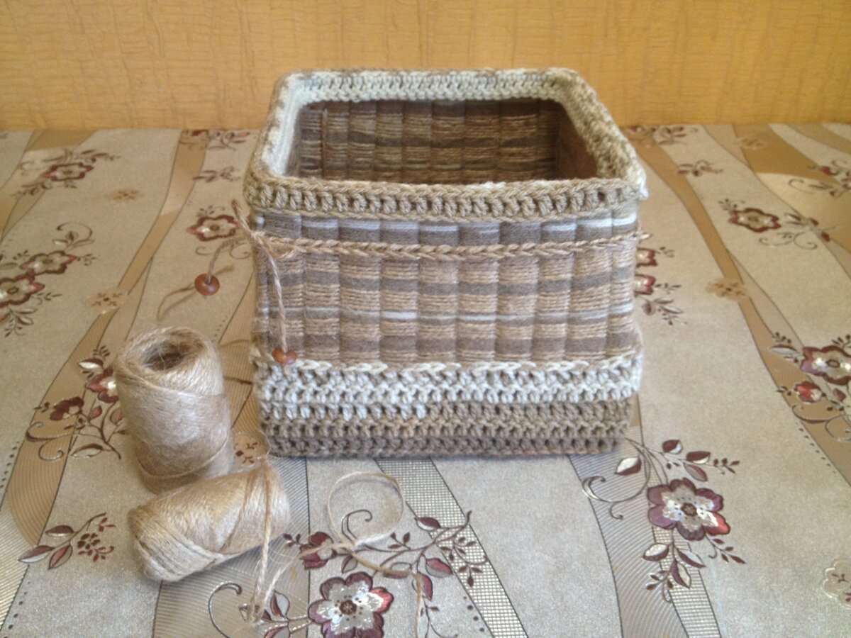 Очень часто мы избавляемся от не нужных вещей в том числе и от коробок. И даже не подозреваем , что именно невзрачную коробочку можно превратить в очень даже интересную, в которой потом мы будем хранить всякие мелки вещи. Для изготовления моего "лукошка " нам понадобится: Шаг 1. Разрезаем нашу коробку на полоски ( но не до конца). Три стороны по 10 полосок (четное число), четвёртая - 9 ( обязательно должно быть не четное число). Шаг 2. Сделаем в промежутках дополнительные срезы. Если этого не сделать , верёвка будет очень тяжело ложиться. Шаг 3.В шахматном порядке по кругу начинаем продевать верёвку ( можно не клеить) Несколько рядов делаем джутовой верёвкой , несколько шерстяной . И так до самого верха. Причем нитки ни те , не другие можно не обрезать. Ближе к верху можно немного стянуть для придания более