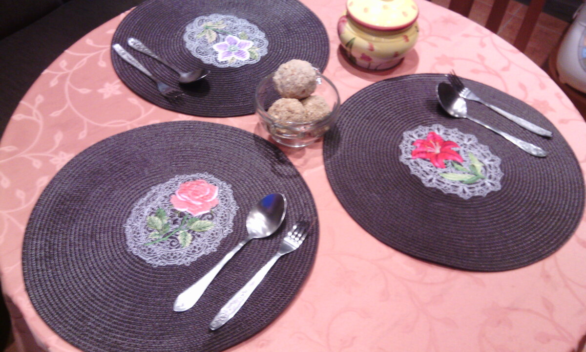 На нашем обеденном столе всегда скатерть. Текстиль придает особую атмосферу и уют дому. Да кухонный текстиль маркий и конечно он должен быть опрятным, чистым - без пятен. Со стиркой проблем нет, современные моющие средства решают проблему любых загрязнений. Дополнительным практичным элементом декора являются салфетки, маты из полимерного материала. У них масса преимуществ. - Разнообразие дизайнов, цветов, форм – огромный выбор – под любой интерьер.